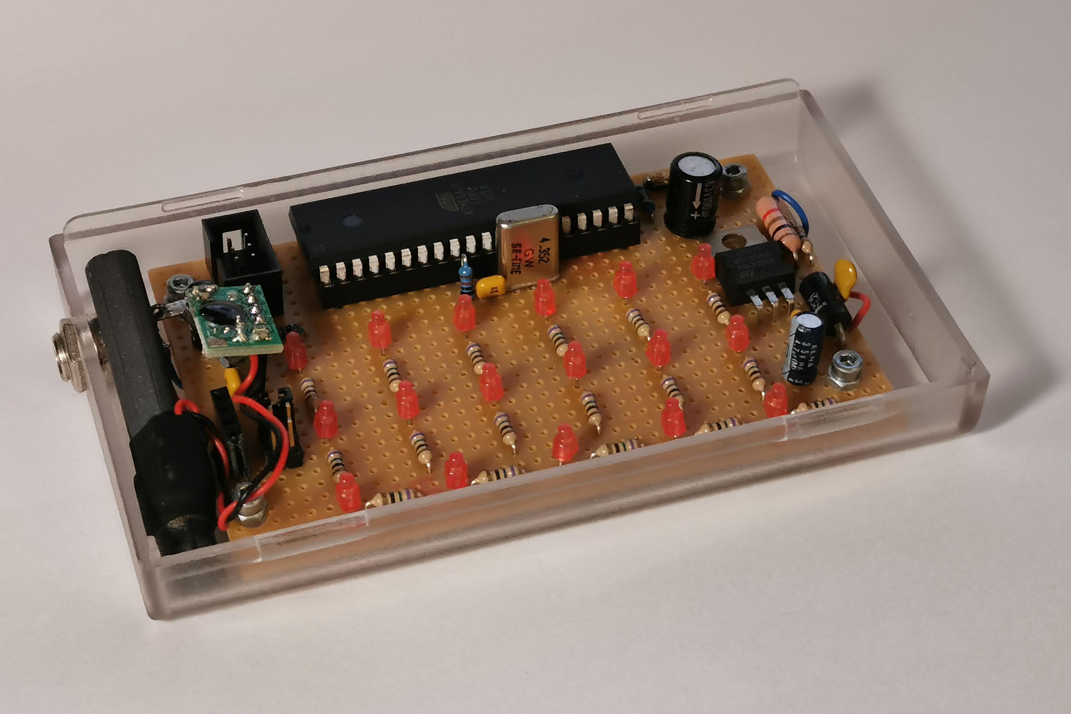Die zweite Variante war die erste selbstentwickelte Binäruhr. Basierend auf einem 40-Pin Atmega16. Die Uhr war prinzipiell freilaufend, musste aber initial über das DCF77-Signal synchronisiert werden. Die LEDs und das DCF77-Modul sind direkt mit dem Mikrocontroller verdrahtet.