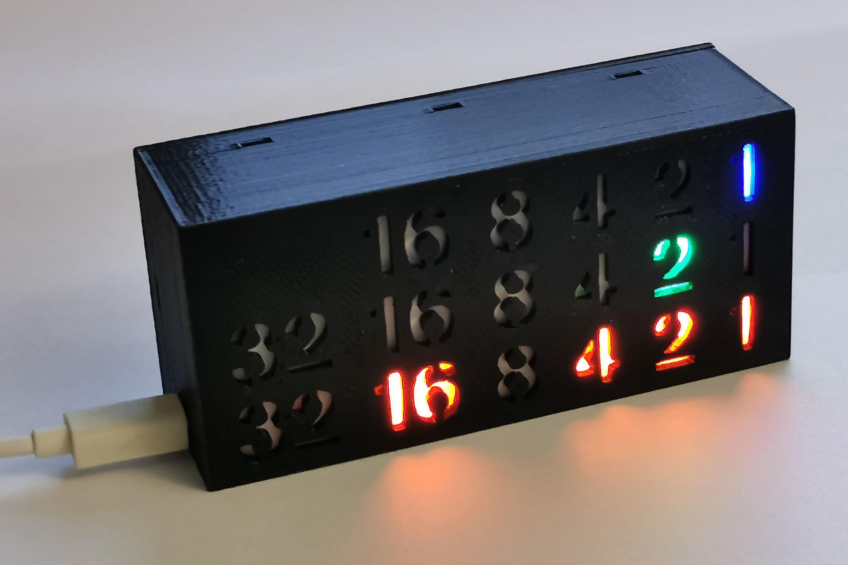 Noch ein Projekt, welches ich schon vor sehr langer Zeit gemacht habe: Eine Binäruhr, welche sich synchronisieren lässt.