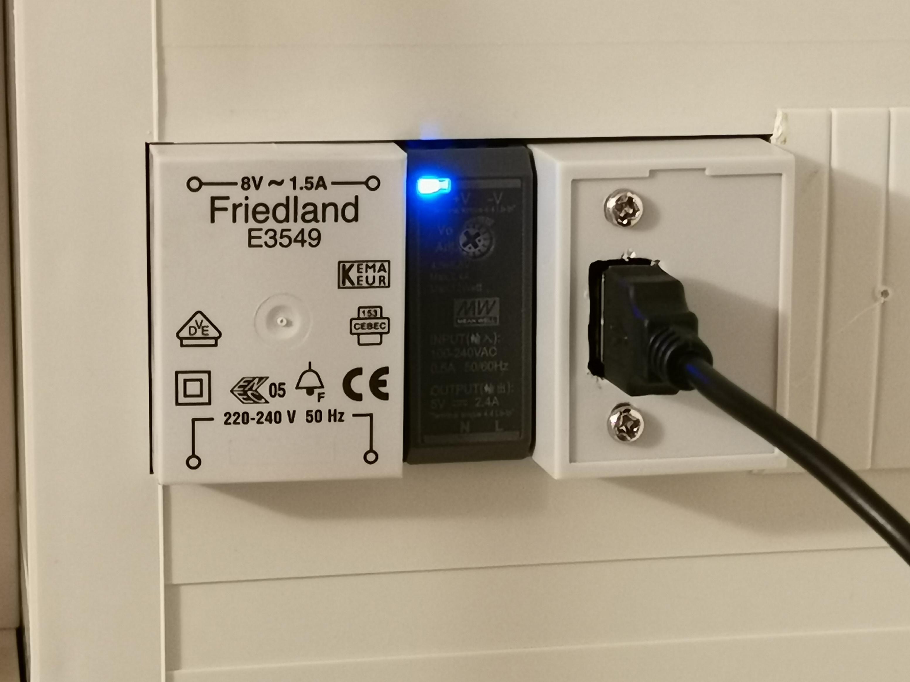 Für die Schaltung habe ich mir ein 5 V Schaltnetzteil im Zählerschrank eingebaut (Achtung: Netzspannung; Man sollte wissen, was man da tut...). Am Netzteil kann man die Spannung bis 4 V heruntersetzen (da das LoRa Modul ja offiziell keine 5 V unterstützt).