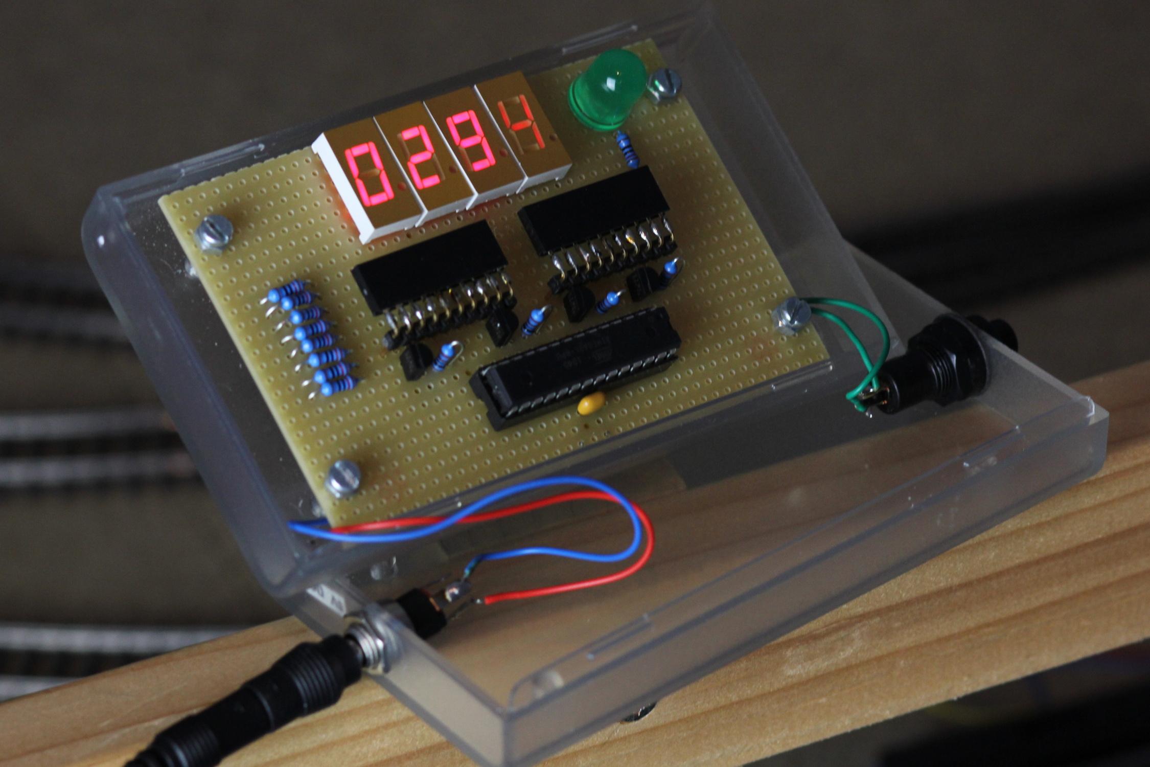 Die Schaltung wird von einem 5V-Steckernetzteil gespeist. Die ISP-Schnittstelle ist nicht verbunden, der AVR wurde extern programmiert. Die vier Transistoren werden für das Multiplexing der Segmentanzeigen benötigt. Die Vorwiderstände weiß ich leider nicht mehr auswendig, aber es sollte kein Hexenwerk sein diese zu berechnen. Als Taktgeber wird der interne Oszillator genutzt. Der reicht voll und ganz aus. 📄 schematic.pdf
