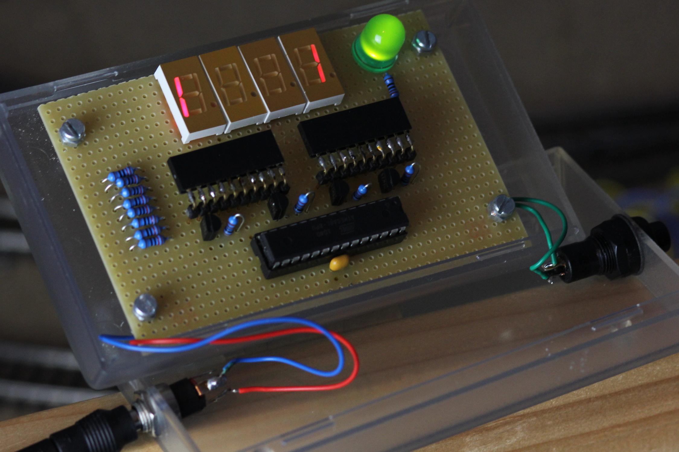 Im Kern steckt ein ATmega8, welcher eine LED, Sieben-Segment-Anzeigen und einen Tester ansteuert. Sobald der Taster gedrückt wird, werden zwei Balken angezeigt. Sobald die LED angeht (pseudozufällig verzögert), muss der Taster schnellstmöglich gedrückt werden. Macht man dies, dann zeigt die Sieben-Segment-Anzeige die benötigte Reaktions-Zeit in Millisekunden an. Drückt man zu früh den Taster wird “FAIL” ausgegeben. Der Taster ist als Öffner ausgeführt war ursprünglich als Öffner geplant, damit das Ergebnis genauer ist.