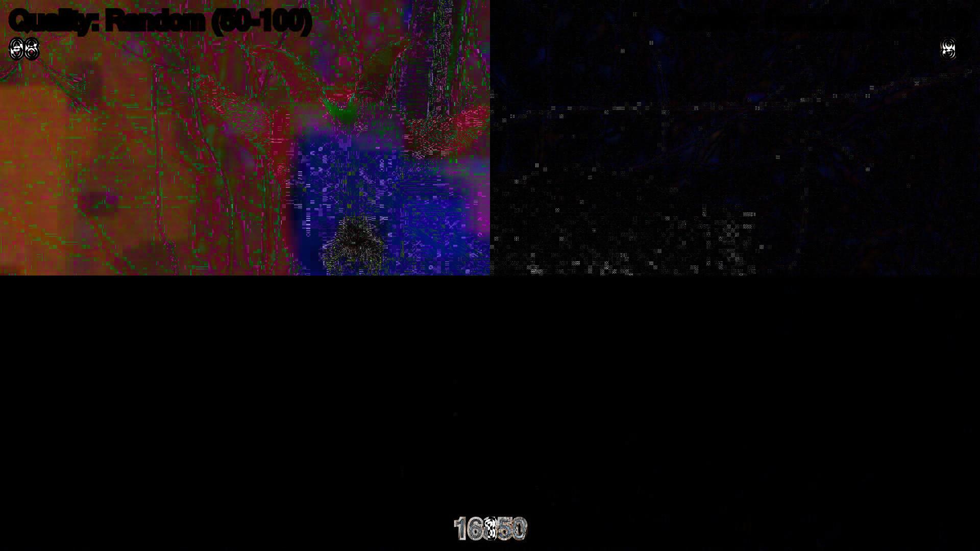 Ich habe ein Testprogramm in C# unter Windows geschrieben, welches ein Bild immer und immer wieder komprimiert. Dies habe ich mit vier verschiedenen Qualitätsparametern ausprobiert: - 50% - 85% - Zwischen 50% und 100% (Zufall für jedes Frame) - Zwischen 85% und 100% (Zufall für jedes Frame)